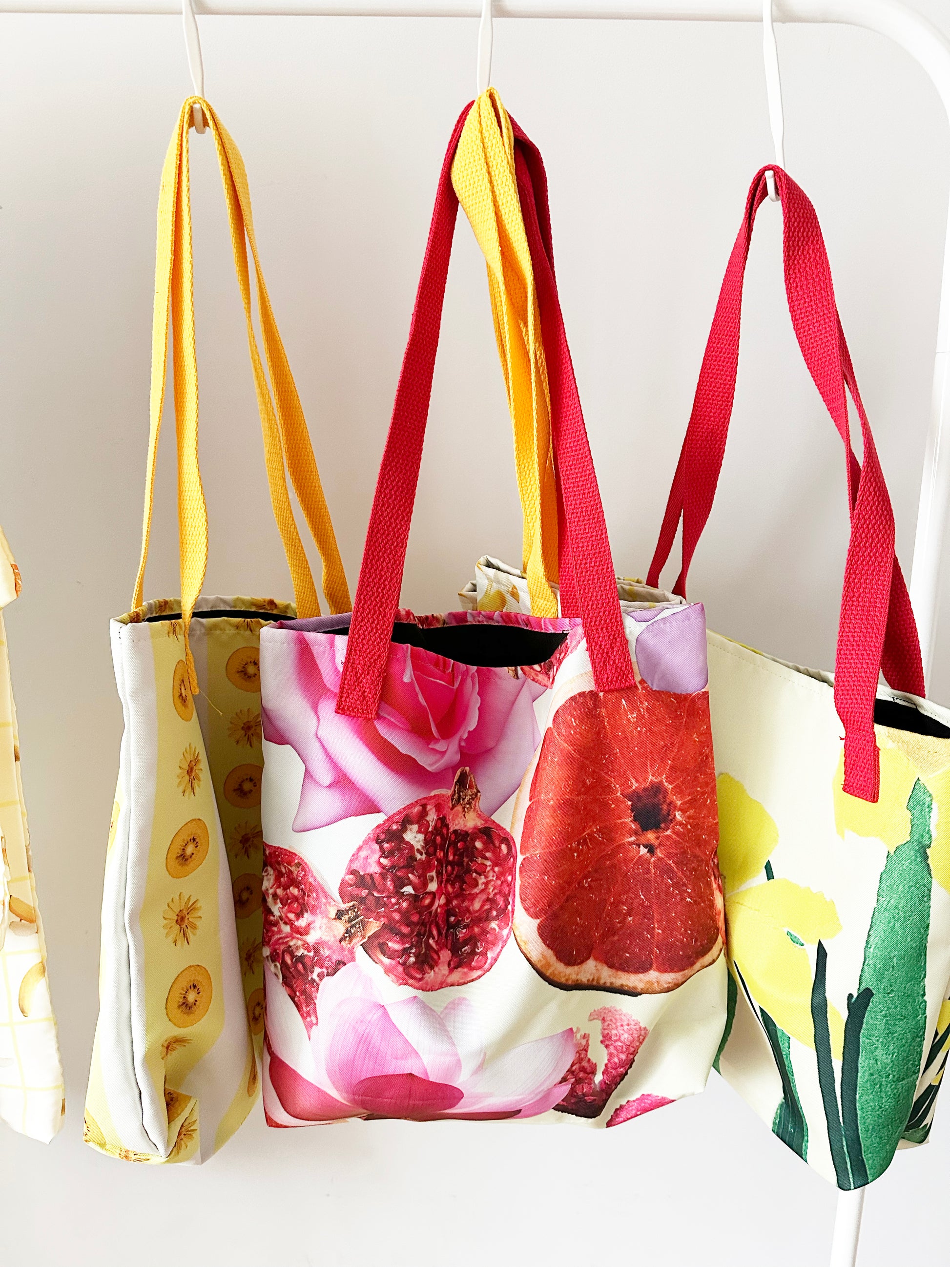 Description: Del delights in weaving fruit into her patterns and art, playfully experimenting with organic shapes and vibrant colours! Product Details:Colour: Red, pastel yellow, pinks, black and brown. Material: Handle: 100% cotton bull denim Bag:100% spun polyester fabric Weight: 245g/m² Handle Length: 30 cm Designed by Del in Australia